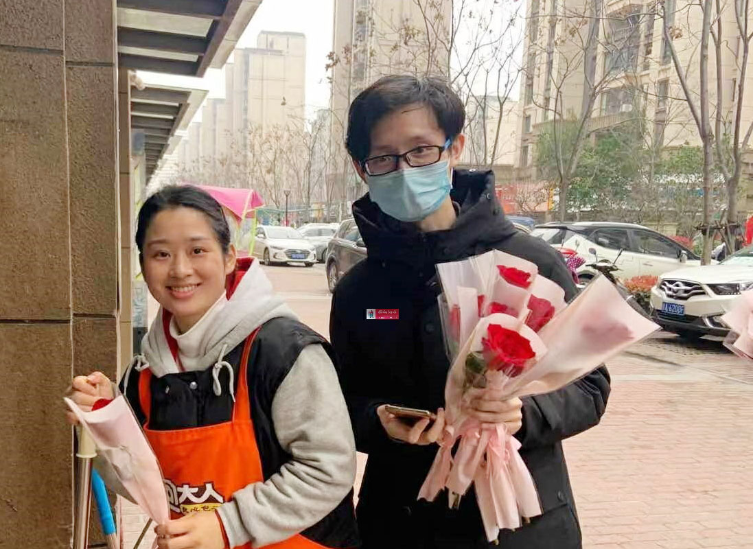 3月8日一大早,物业客服们开始准备鲜花,为每朵鲜花系上美丽的彩带。每个楼栋的客服扮起了“送花使者”。收到鲜花的业主们都很开心,纷纷与我们的“送花使者”合影留念。