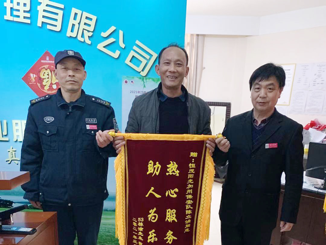 【本讯站】(周庚)3月17日下午,住在恒茂阳光加州53栋203的业主涂先生高高兴兴提着印有“热心服务,助人为乐”字样的锦旗来到物业管理处。沟通中,涂先生讲述道:“自住在恒茂阳光加州小区以来,平时有问题反映时,物业工作人员服务态度和蔼可亲,及时解决问题,感觉就像一家人一样。” 3月8日上午,保安队长吴义党和巡逻岗陈立洪例行巡逻至53栋时,看见涂先生正在搬家具,于是主动上前帮忙。涂先生特别感动。
