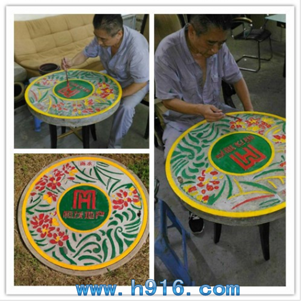 国际都会小区内绿化郁郁葱葱,景色宜人。但是,小区内的窨井盖却款式单一,显得与周边优雅的环境格格不入。怎样来改变这些窨井盖的形象。大家一商量后,觉得用彩色油漆涂鸦在窨井盖上,会是个不错的主意。随后工程部小伙伴们买来各色颜料,将窨井盖洗干净后,开始了涂鸦作业。很快,一块块灰蒙蒙的窨井盖上,便出现了迎梅花、山水画等景色。