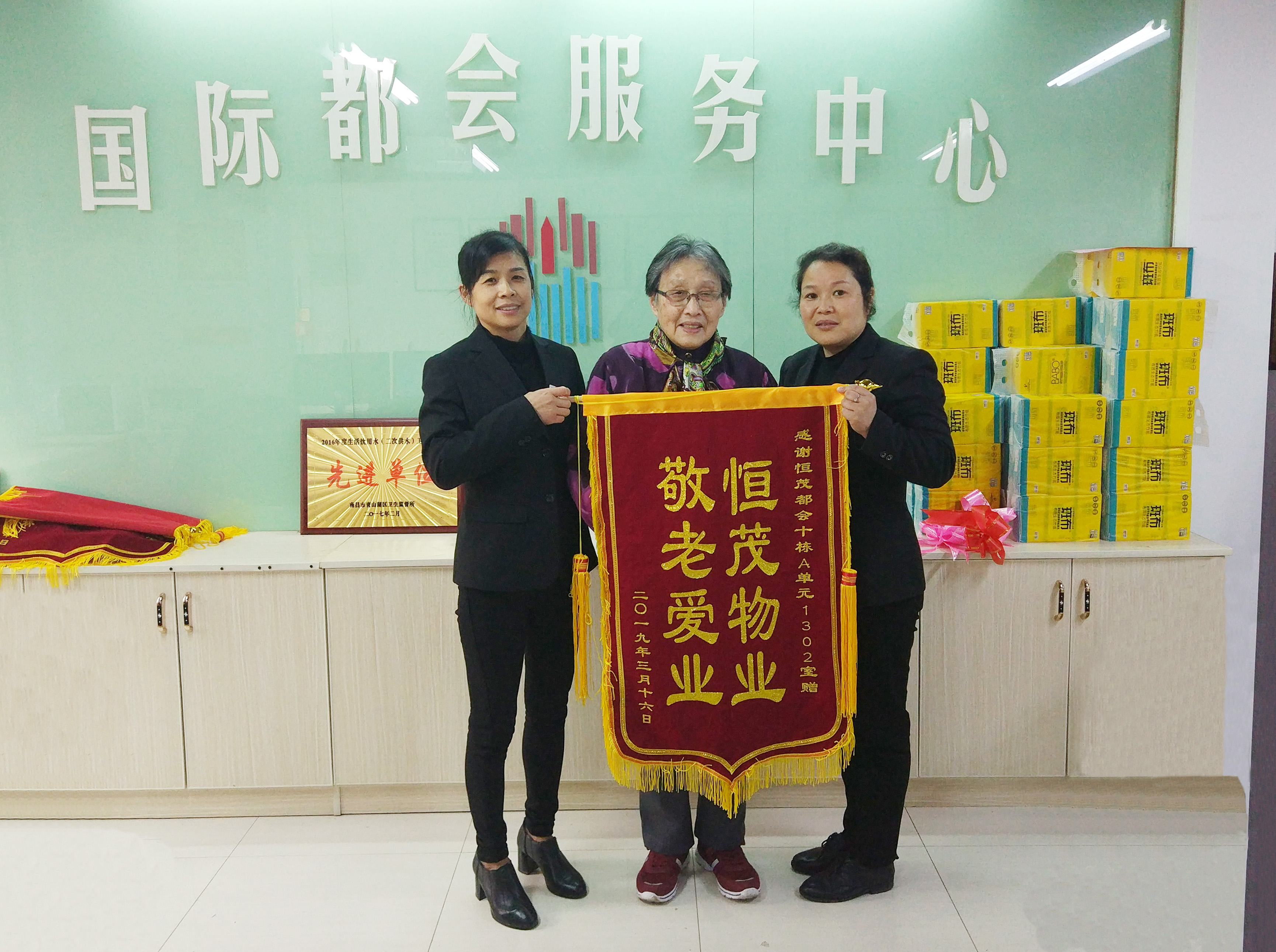 对于恒兴物业慰问老人、关爱老人的举动,很多老人表示满意和感谢!近日,家住南昌恒茂国际都会小区10栋A单元的万女士便给物业客服中心送来一面锦旗,感谢物业工作人员长期以来的关心和爱护。