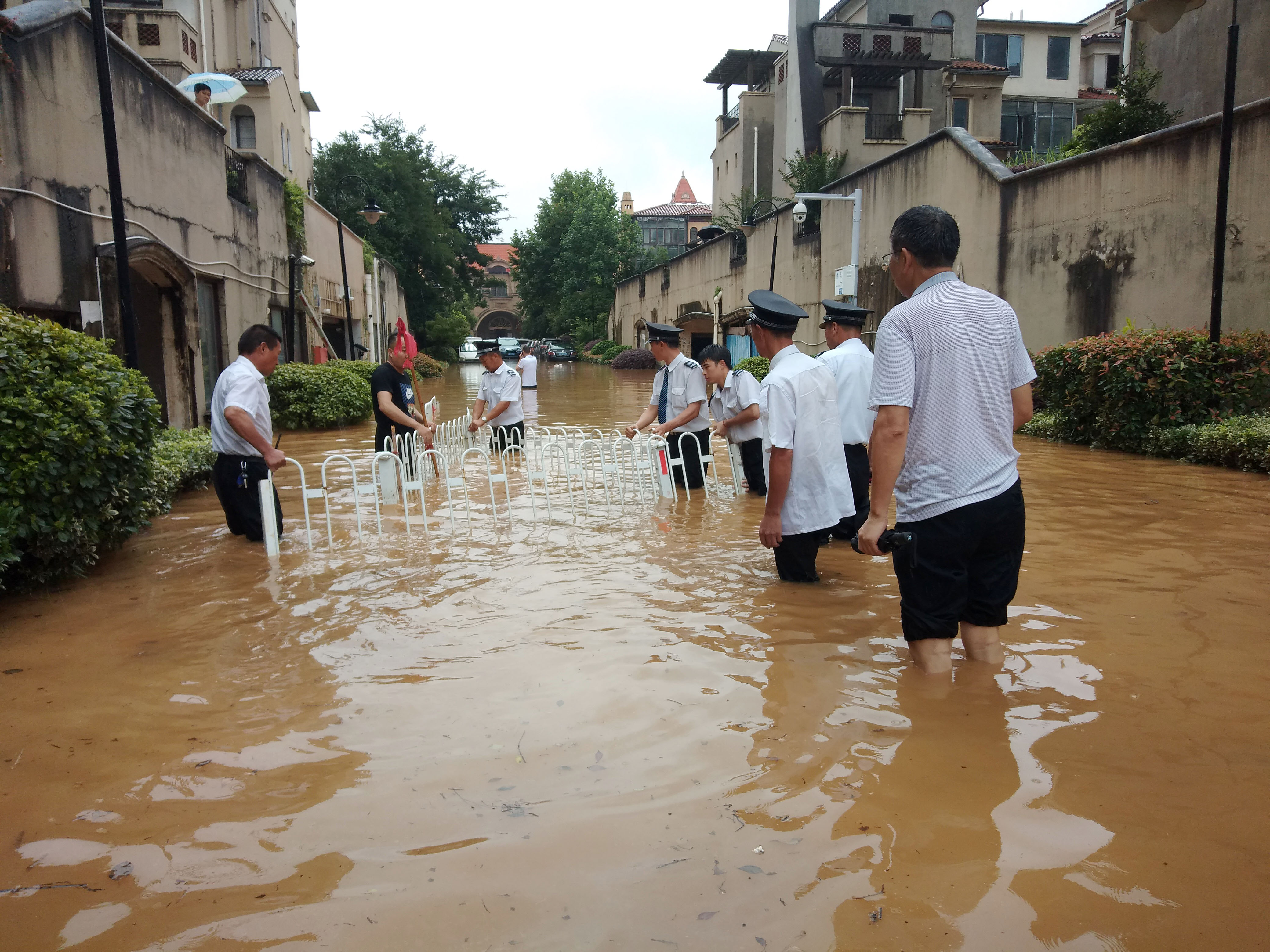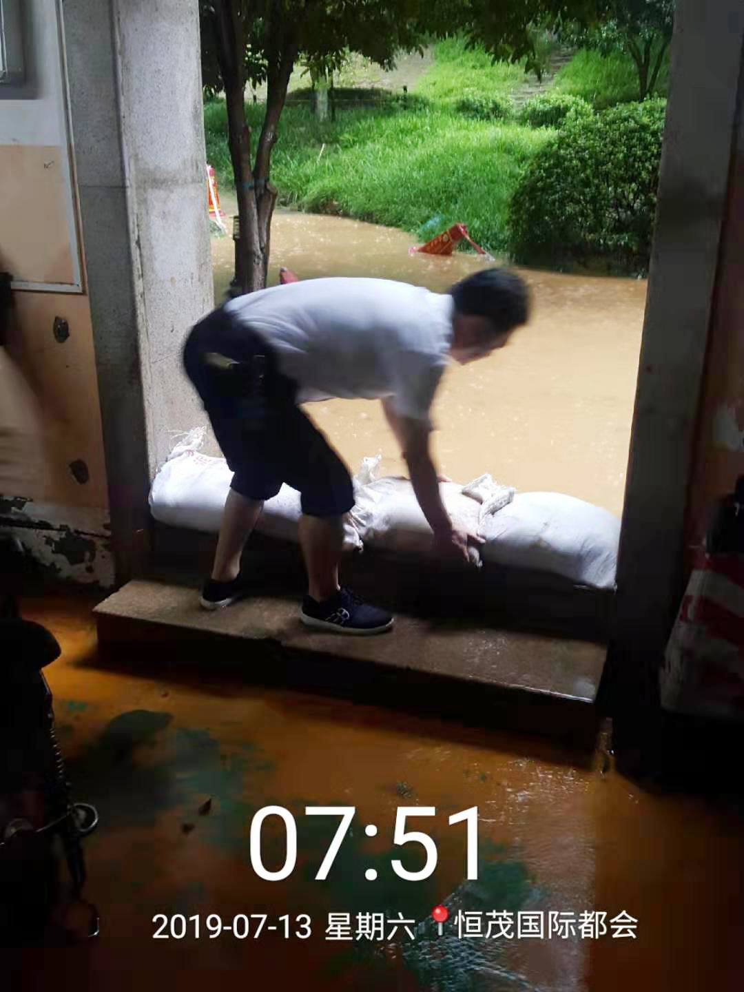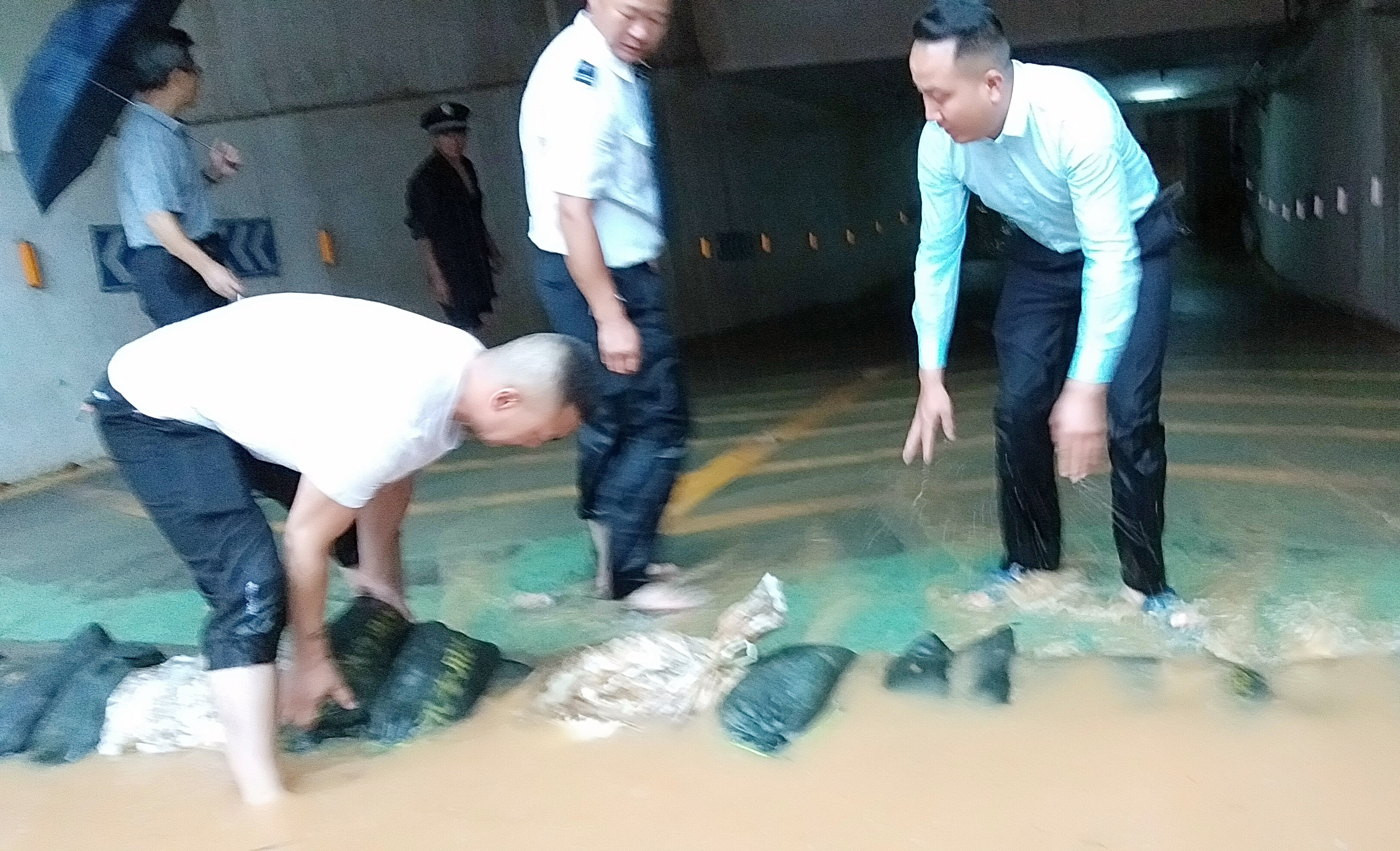 7月13日早上,客服中心全体工作人员提前到岗,分区域进行了巡查,并且对低洼积水路段及地下车库临时增加了排污泵及时排水。小区1号通道由于地势低洼,积水严重,工程部、秩序部工作人员在1号通道通往地下车库进出口放置了抗洪沙袋,避免雨水冲进地库。