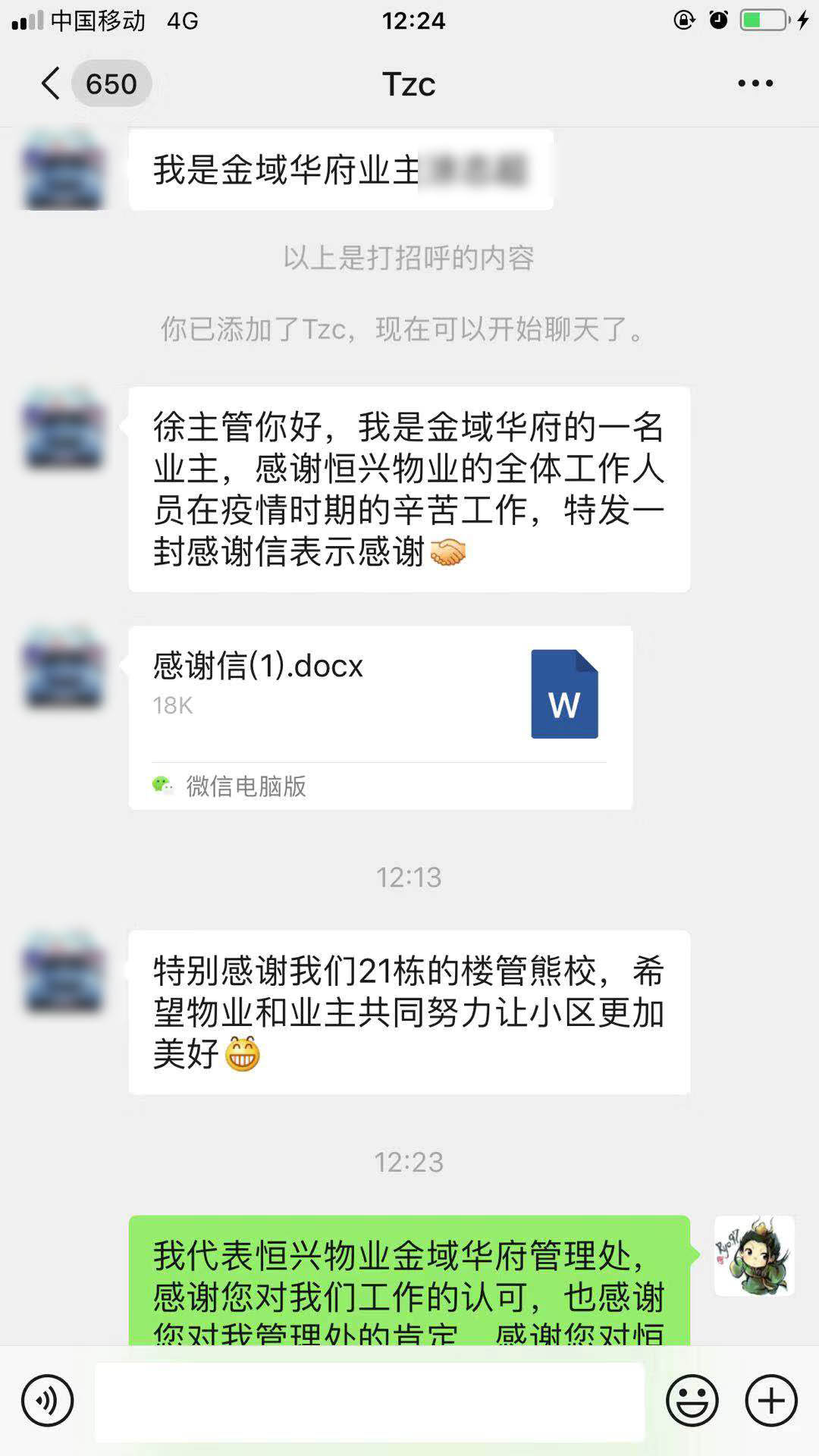 2月11日,家住金域华府小区的业主涂先生通过微信向恒兴物业金域华府客服中心客服主管徐明发来一封感谢信。涂先生在信中表示,感谢恒兴物业全体工作人员在疫情期间的辛苦工作!