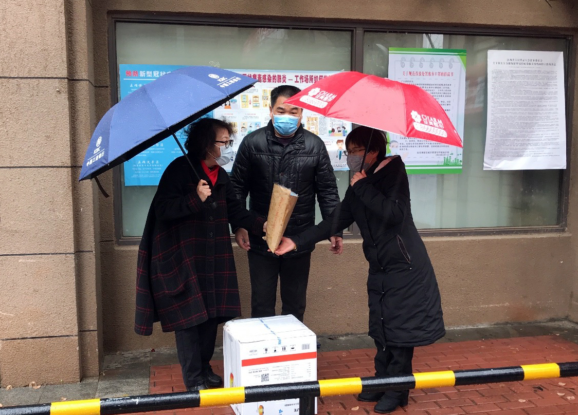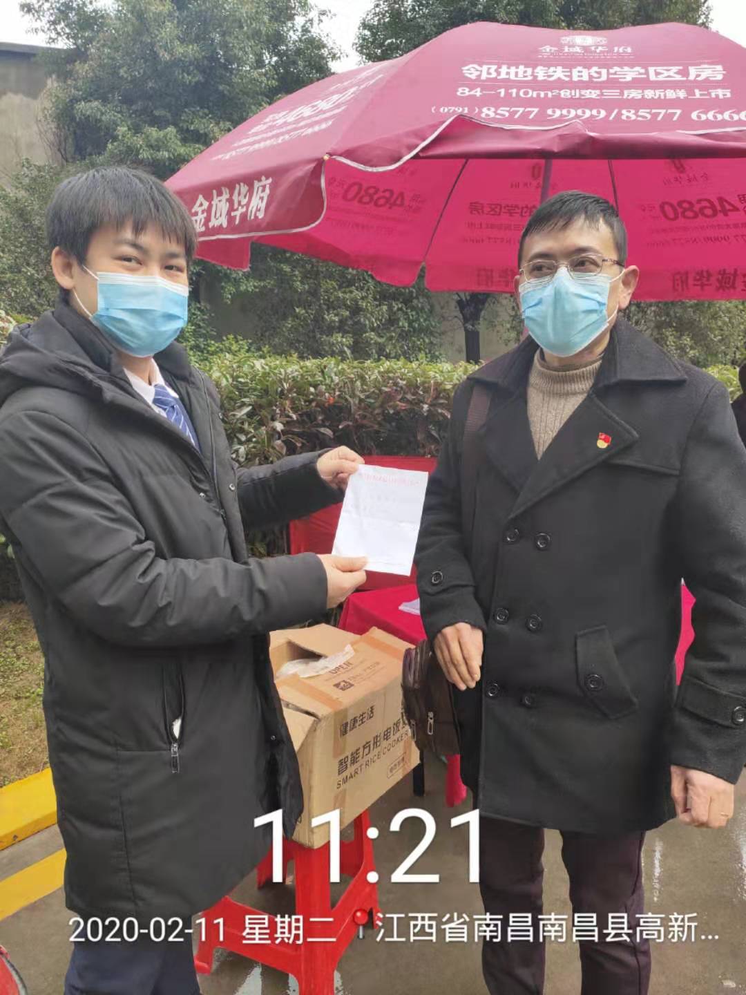 当天下午,暖心的画面再度上演,又有两位住在E区的业主给物业捐赠了口罩和取暖器。