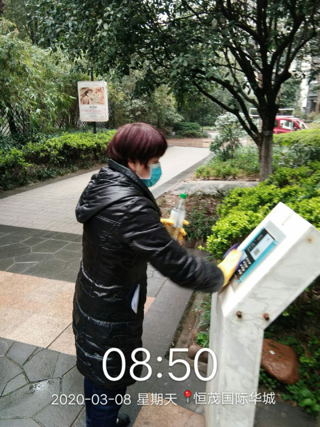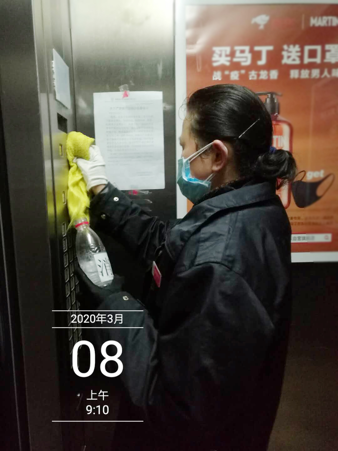 与此同时,恒茂国际华城客服中心客服部楼管姐姐们戴上手套,对各自负责的楼栋内公共区域进行消毒,如单元门禁按键、大堂门把手、电梯内外按键等业主经常使用的区域。完成楼道内卫生的同时,也把垃圾桶周边和楼梯间进行全面消毒。
