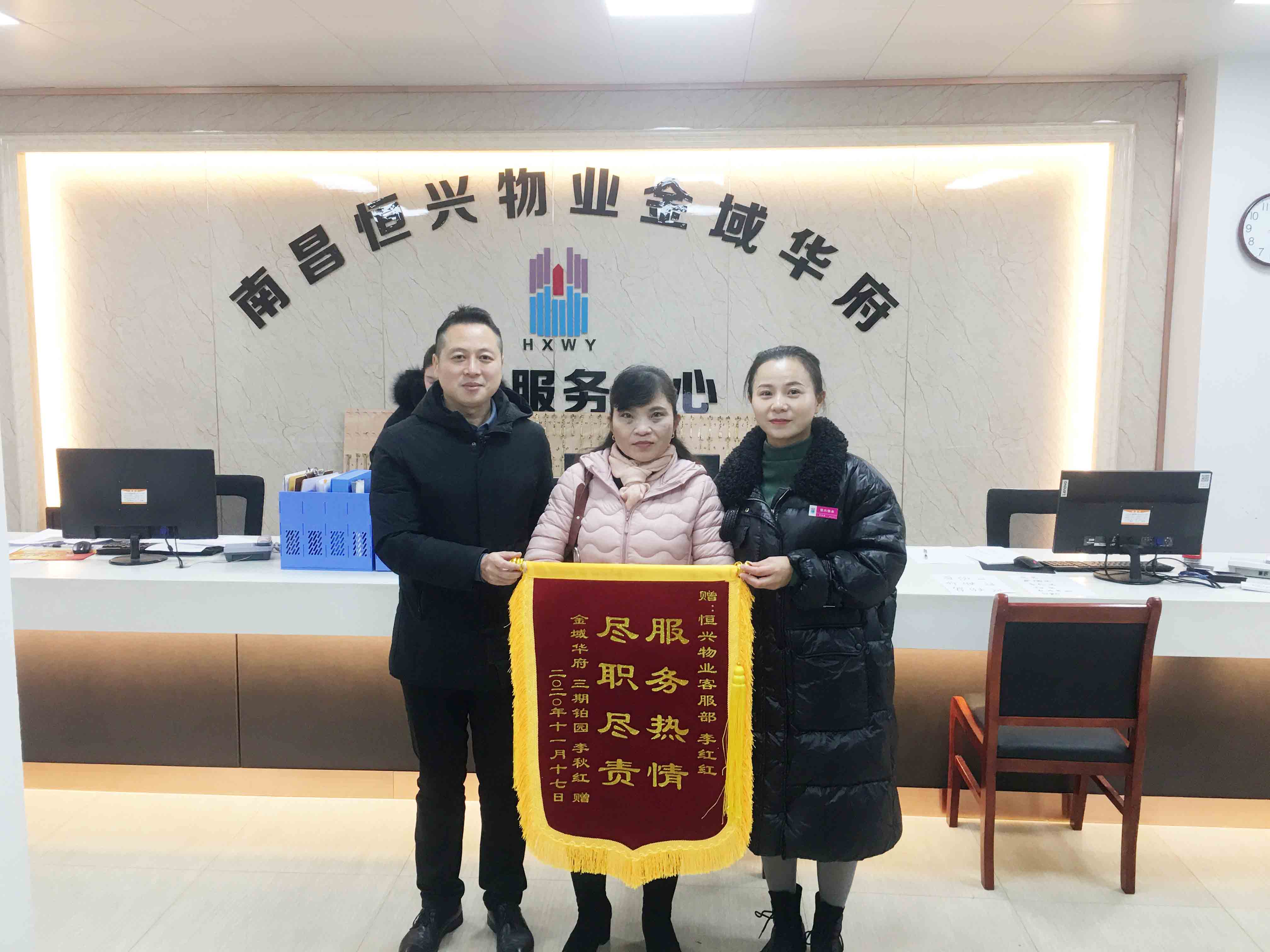 【本站讯】(徐明)12月1日,家住金域华府小区三期铂园的李女士来到物业客服中心,笑容满面的将一面锦旗递到楼栋管家李红红的手中,以此表达对恒兴物业服务的认可。