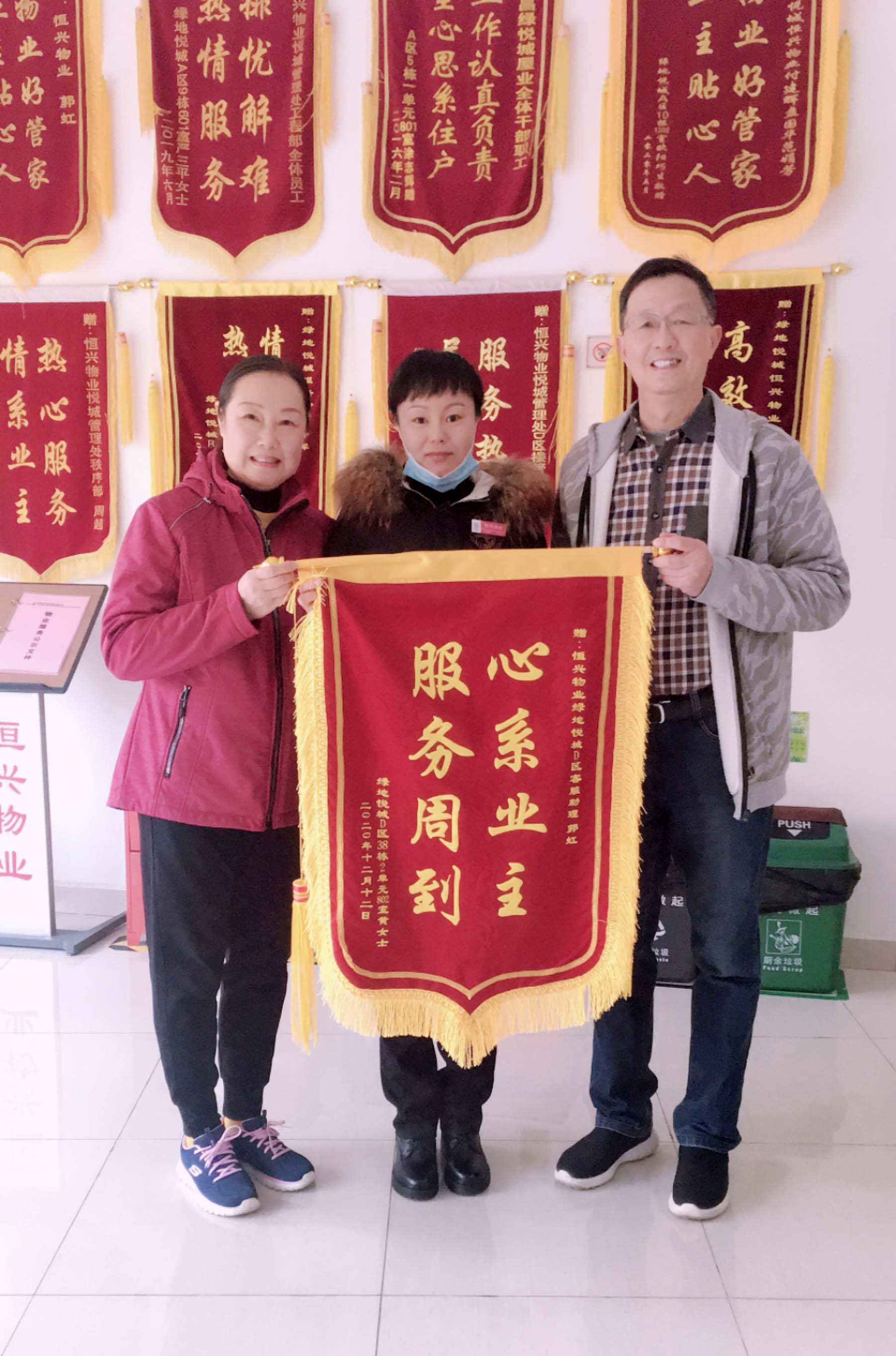 【本站讯】(许晖)2020年12月12日下午,在绿地悦城客户服务中心大厅出现暖心的一幕,家住绿地悦城小区38栋2单元802室的业主黄女士与家人带着一面绣有“心系业主,服务周到”字样的锦旗来到客户服务中心。黄女士激动地说,要把锦旗送给物业管家郭虹,感谢她的周到服务。