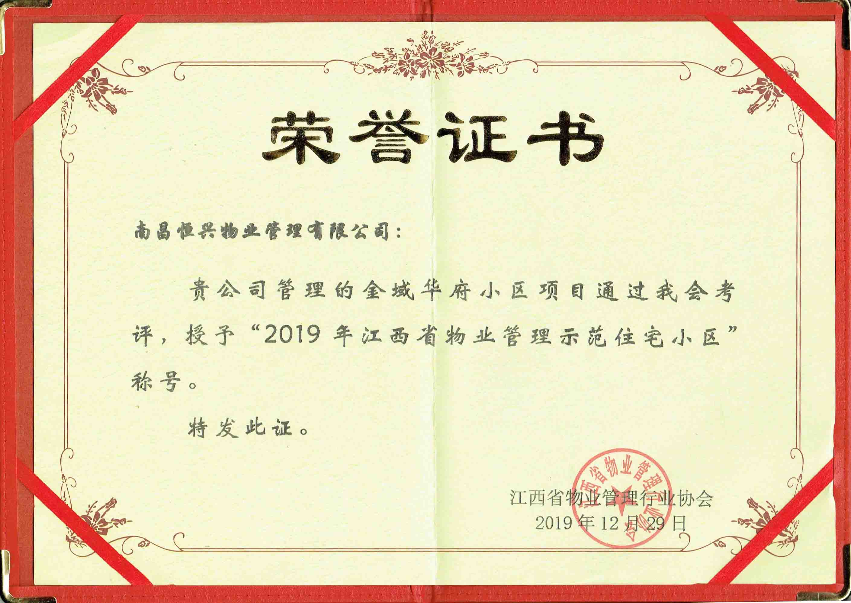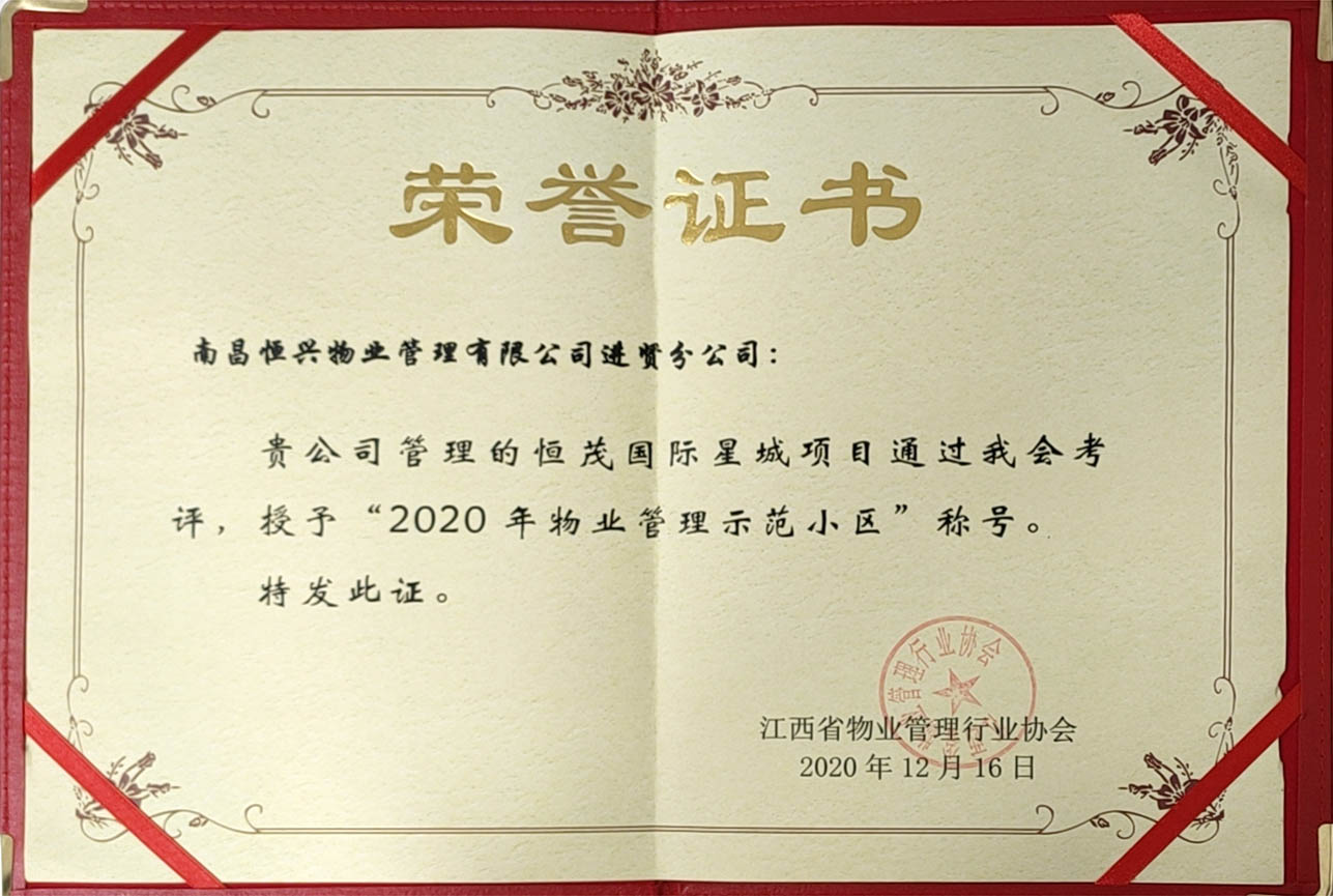 恒兴物业服务的金域华府项目荣获“2019年江西省物业管理示范住宅小区”称号,恒茂国际星城项目荣获“2020年物业管理示范小区”称号。