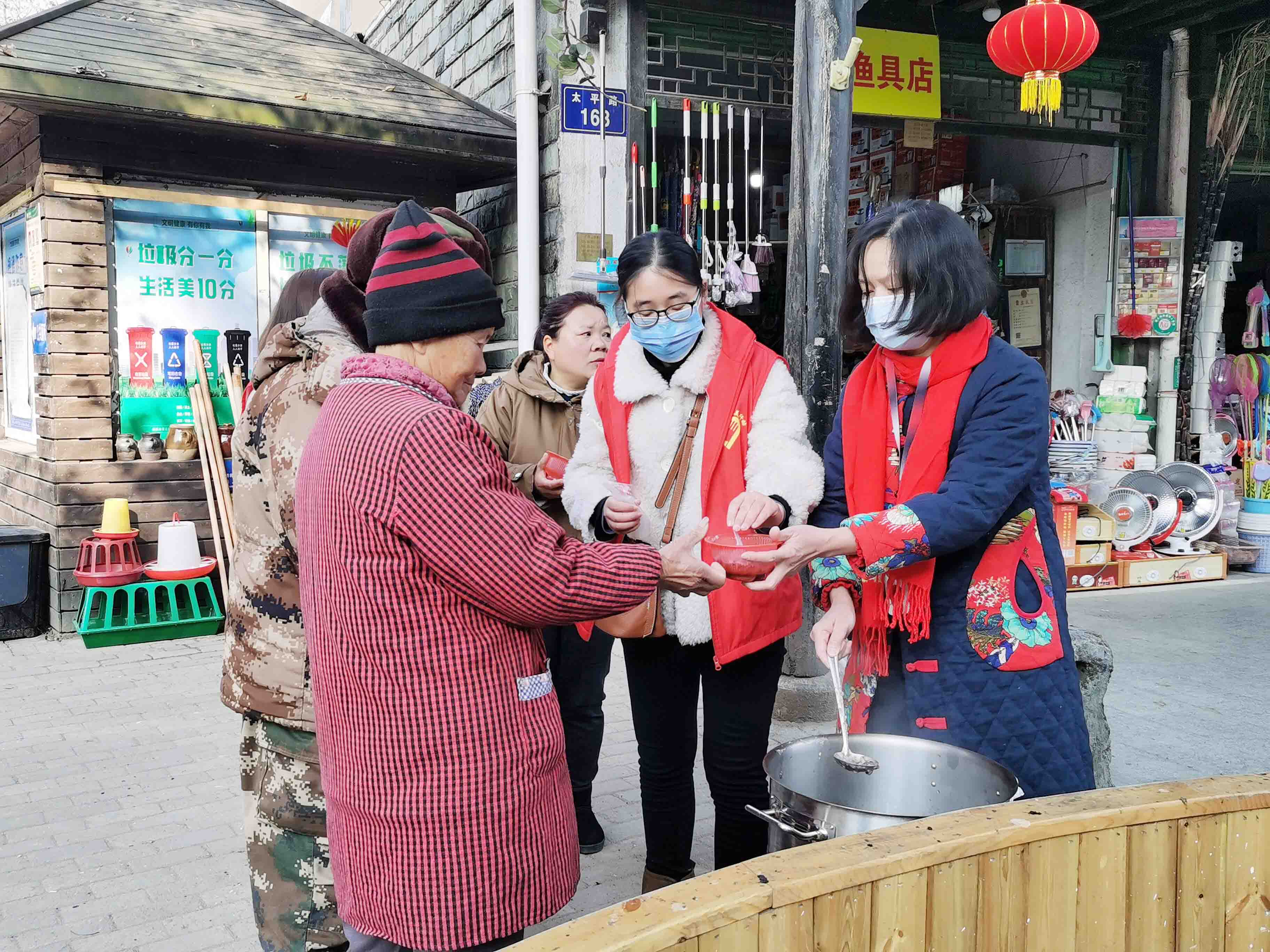 1月19日傍晚,大家伙就开始忙活开来,准备各种食材,有红枣花生、莲子薏仁等,分别用锅熬制各种口味的腊八粥。20日早上8:00开始,恒兴物业森林海客服工作人员在跟热心业主杨老师沟通后,进行了前期准备工作,将熬好的腊八粥装进大汤桶里,准备好一次性餐具,到太平镇社区与社区工作人员会和。在社区工作人员的带领下,大家抬着腊八粥,走街进巷,看望了有60年党龄的老党员、小区居民以及正在工作的环卫工人,为他们盛上一碗热腾腾的腊八粥。