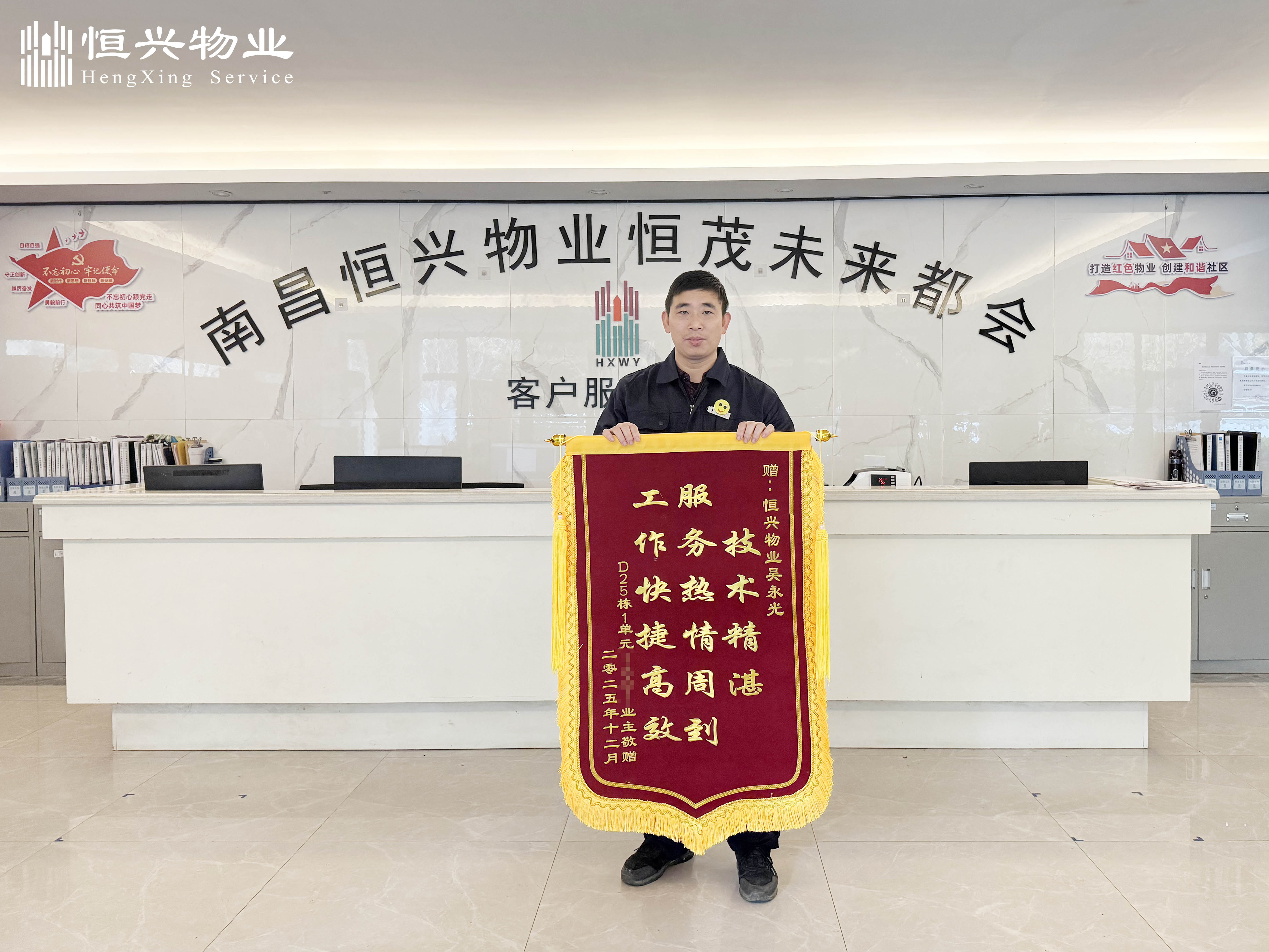 【本站讯】(熊媛媛)2025年12月,未来都会物业服务中心收到了一份特殊的快递——来自未来都会小区D25栋1单元的业主给物业服务中心寄来一面锦旗。此前,该业主计划自行更换家中台盆,却因材料问题陷入困境,安装工作被迫搁置。物业服务中心工程师傅吴永光得知情况后,主动上门协助,帮业主完成了后续的安装工作,用专业高效的技术和热情周到的服务解决了业主的燃眉之急。